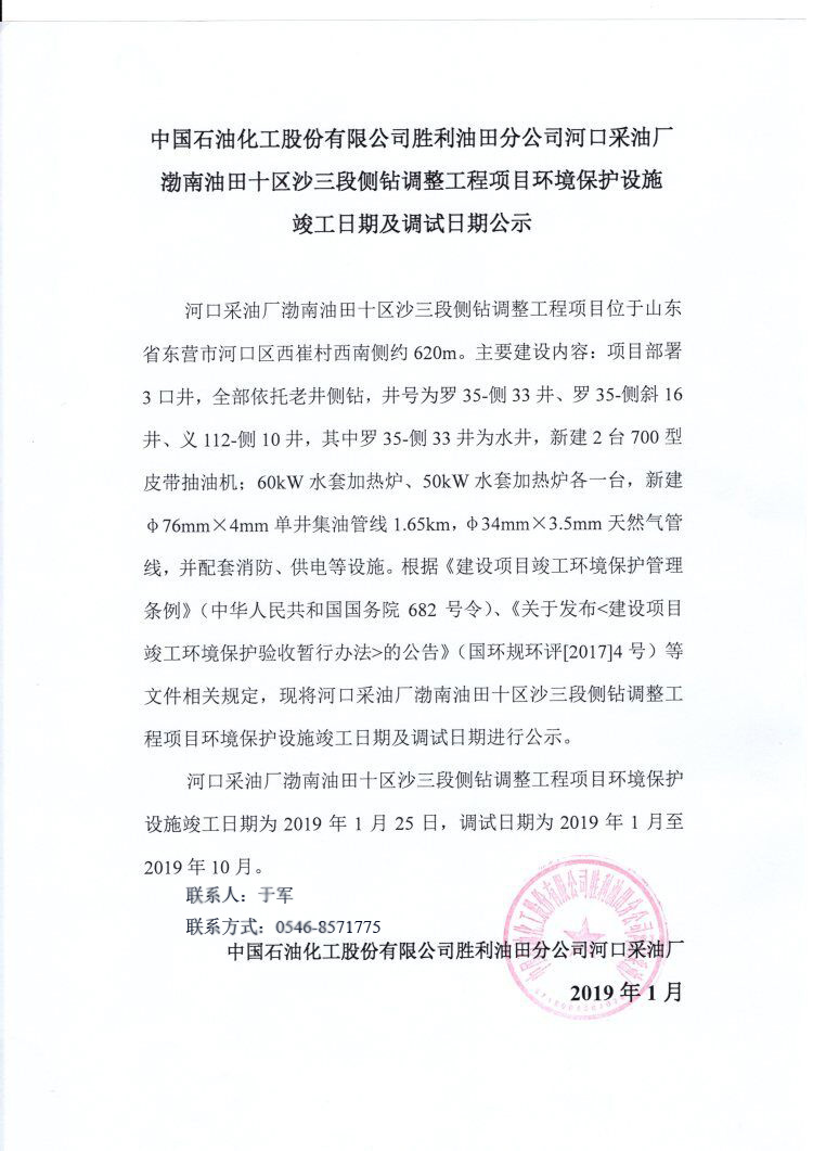 中國石油化工股份有限公司勝利油田分公司河口采油廠渤南油田十區(qū)沙三段側(cè)鉆調(diào)整工程項目環(huán)境保護(hù)設(shè)施竣工日期及調(diào)試日期公示